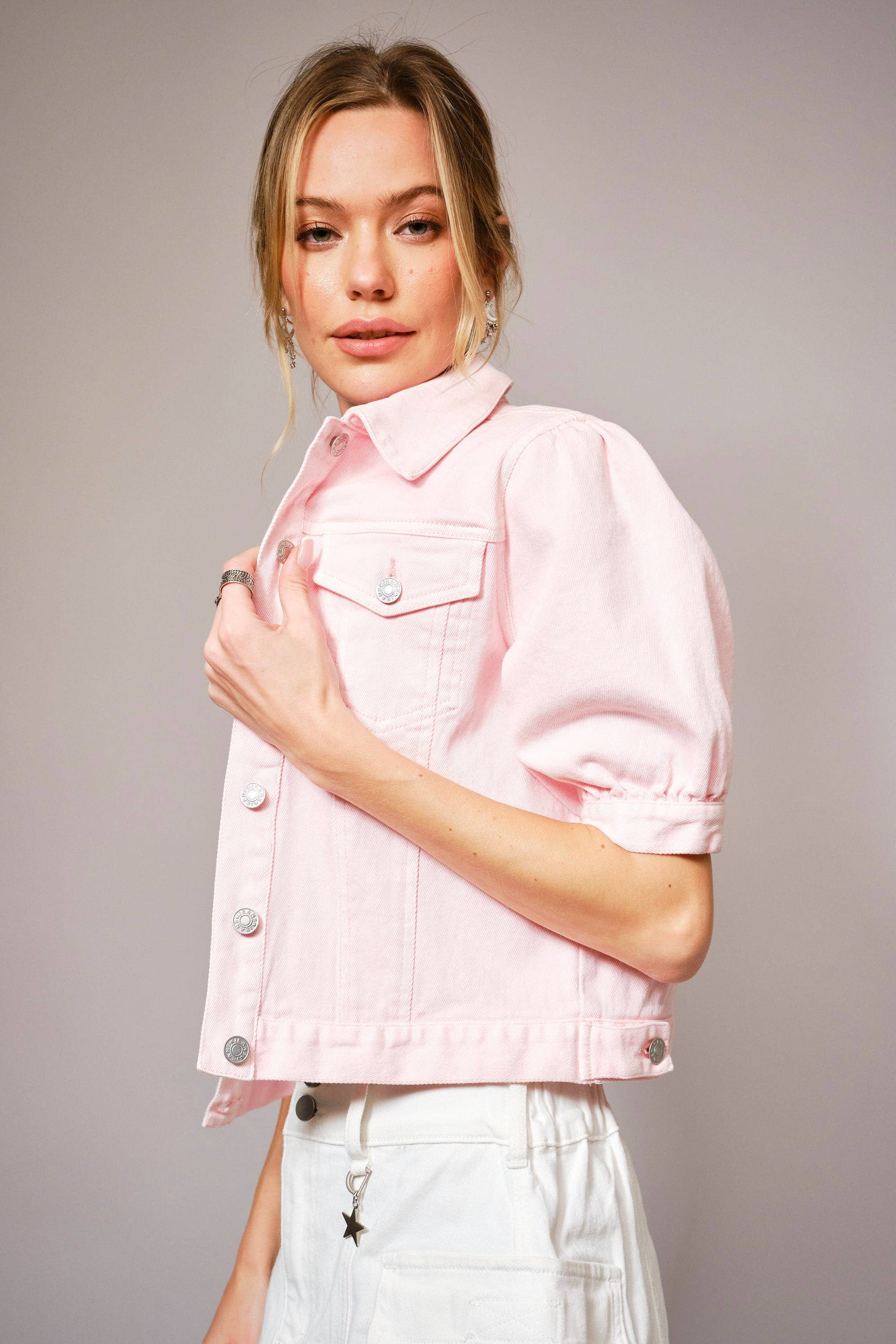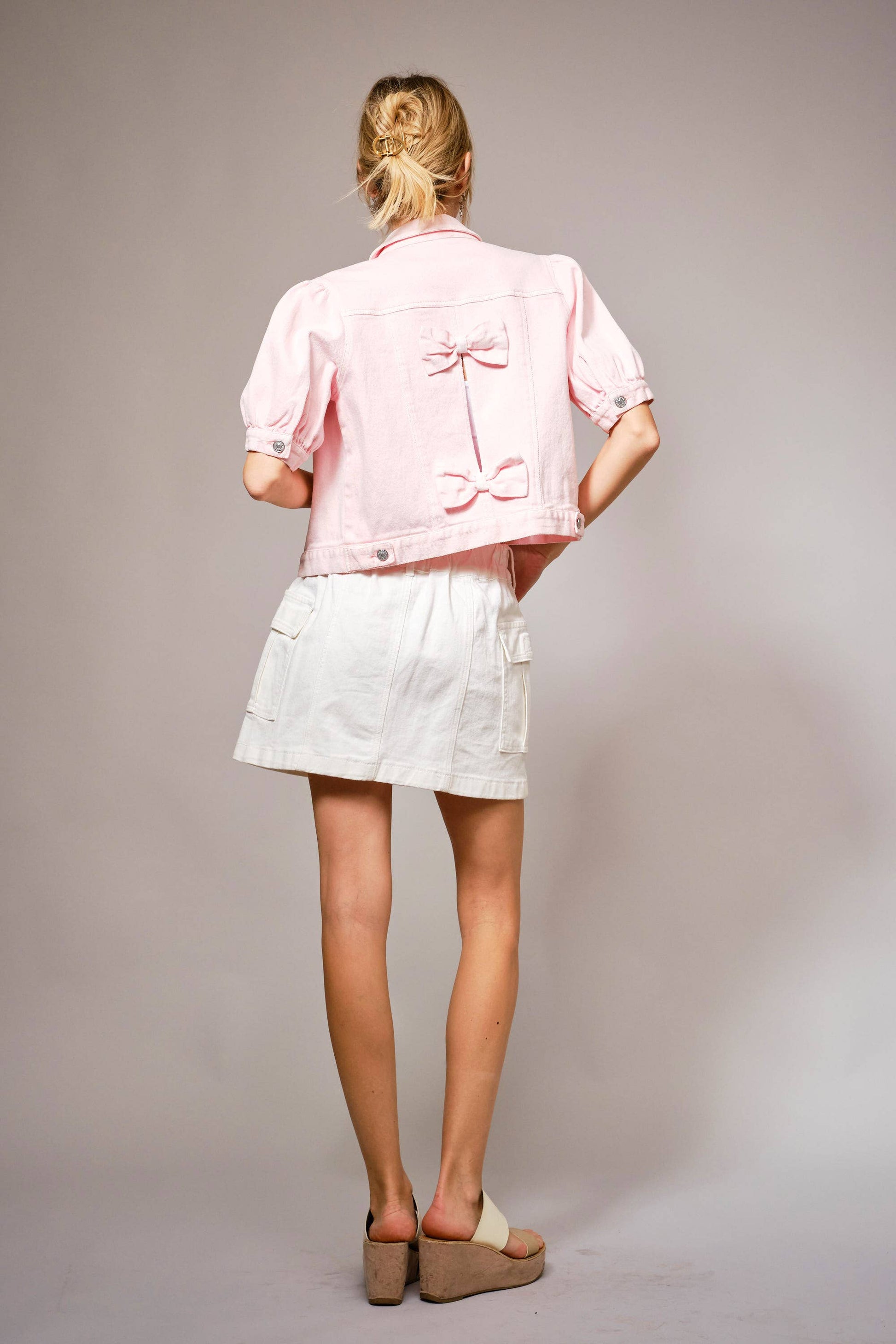 Soft-washed cropped denim jacket featuring puff short sleeves, front button closures, and chest flap pockets. Designed with bow-back detailing. Pale Pink