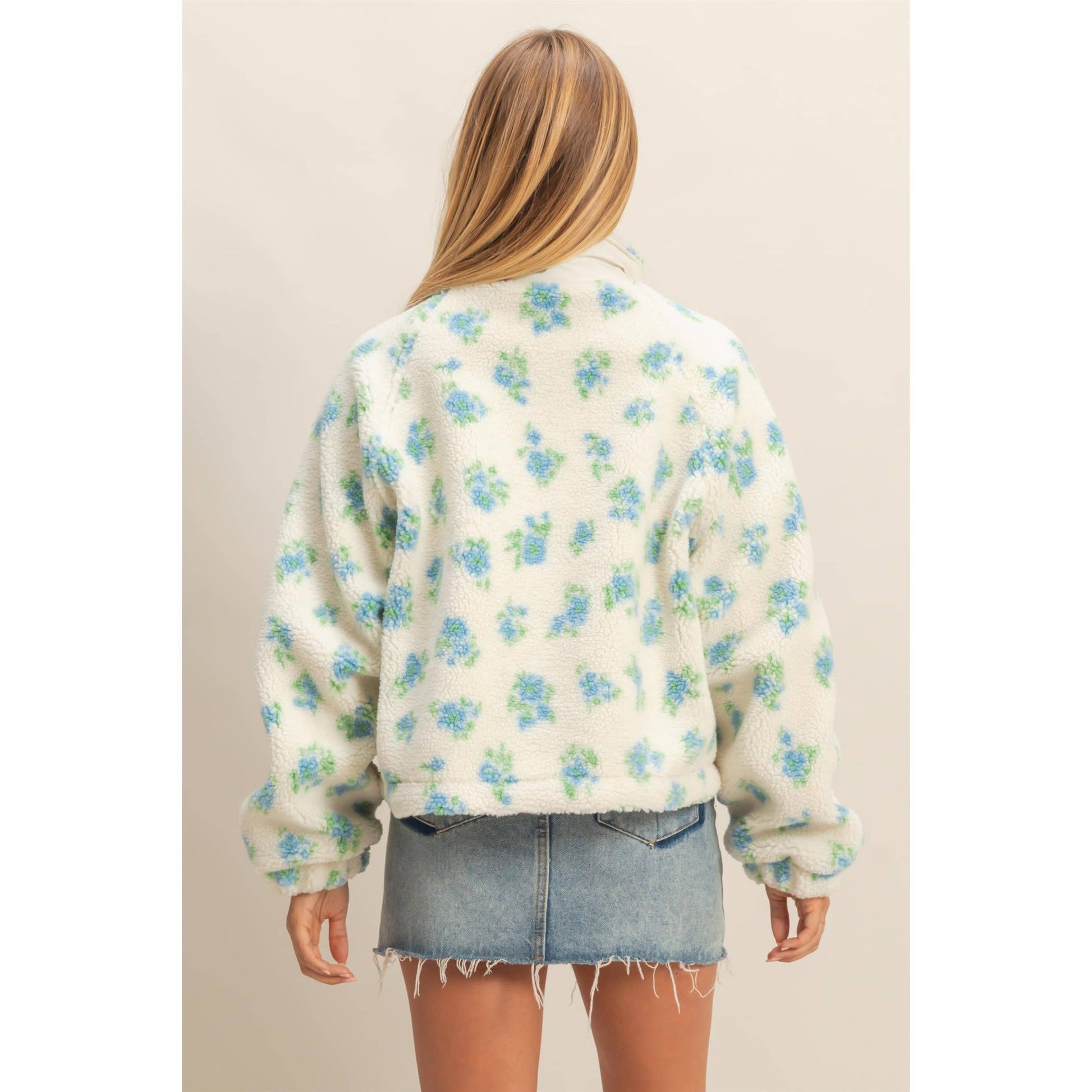 Embrace the cozy side of fashion with this sherpa jacket, featuring a delightful floral print. Its relaxed fit ensures comfort, ideal for layering over a lightweight turtleneck and pairing with denim jeans. Perfect for a casual outing or a cool evening stroll. The jacket's soft texture and charming aesthetics make it a stylish choice for enhancing everyday outfits.
