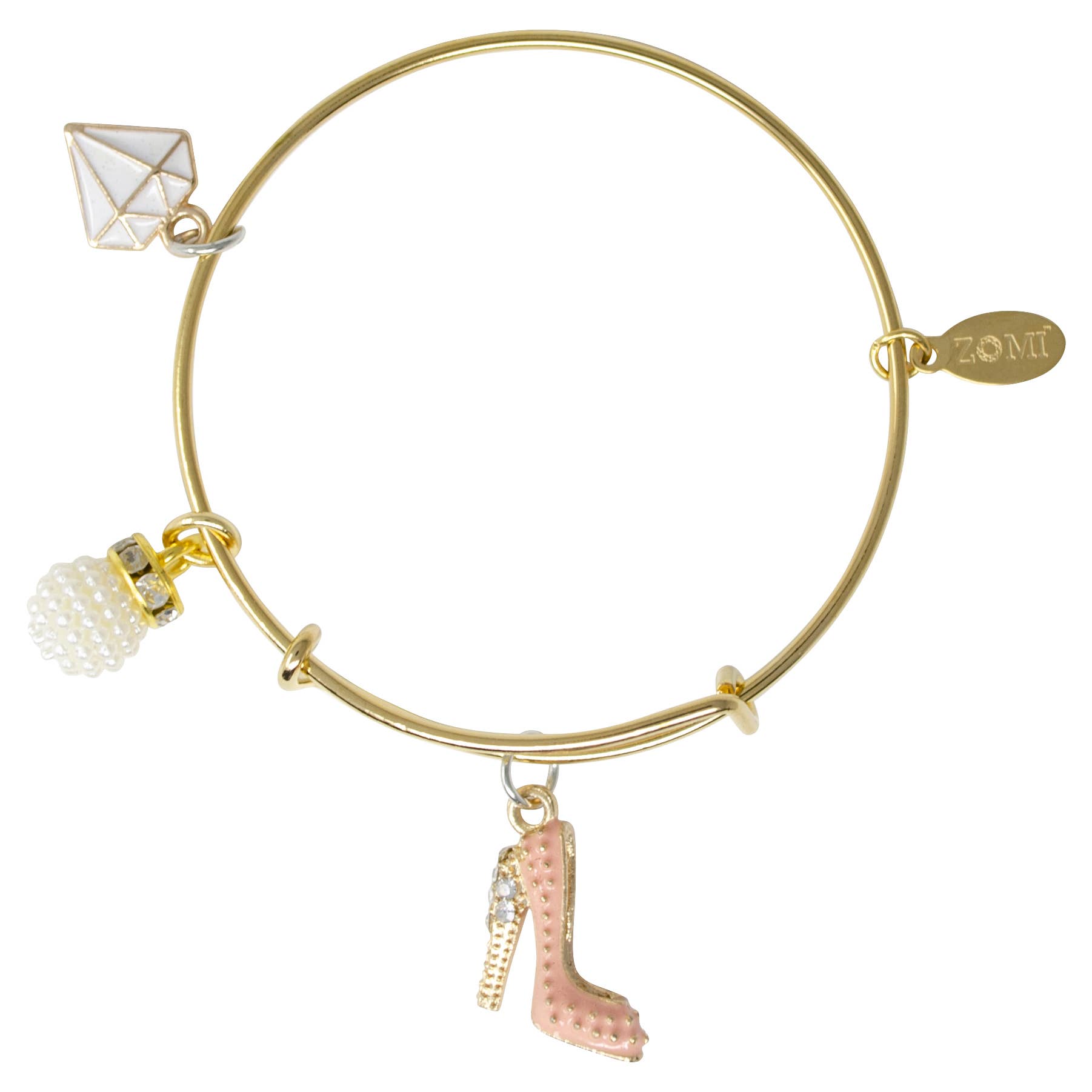 • 18K Gold plated adjustable bangle bracelet for kids • Size 2in - 2.5in adjustable • Comes with all the charms shown in image • Individually packaged • Assembled in the USA with imported parts •