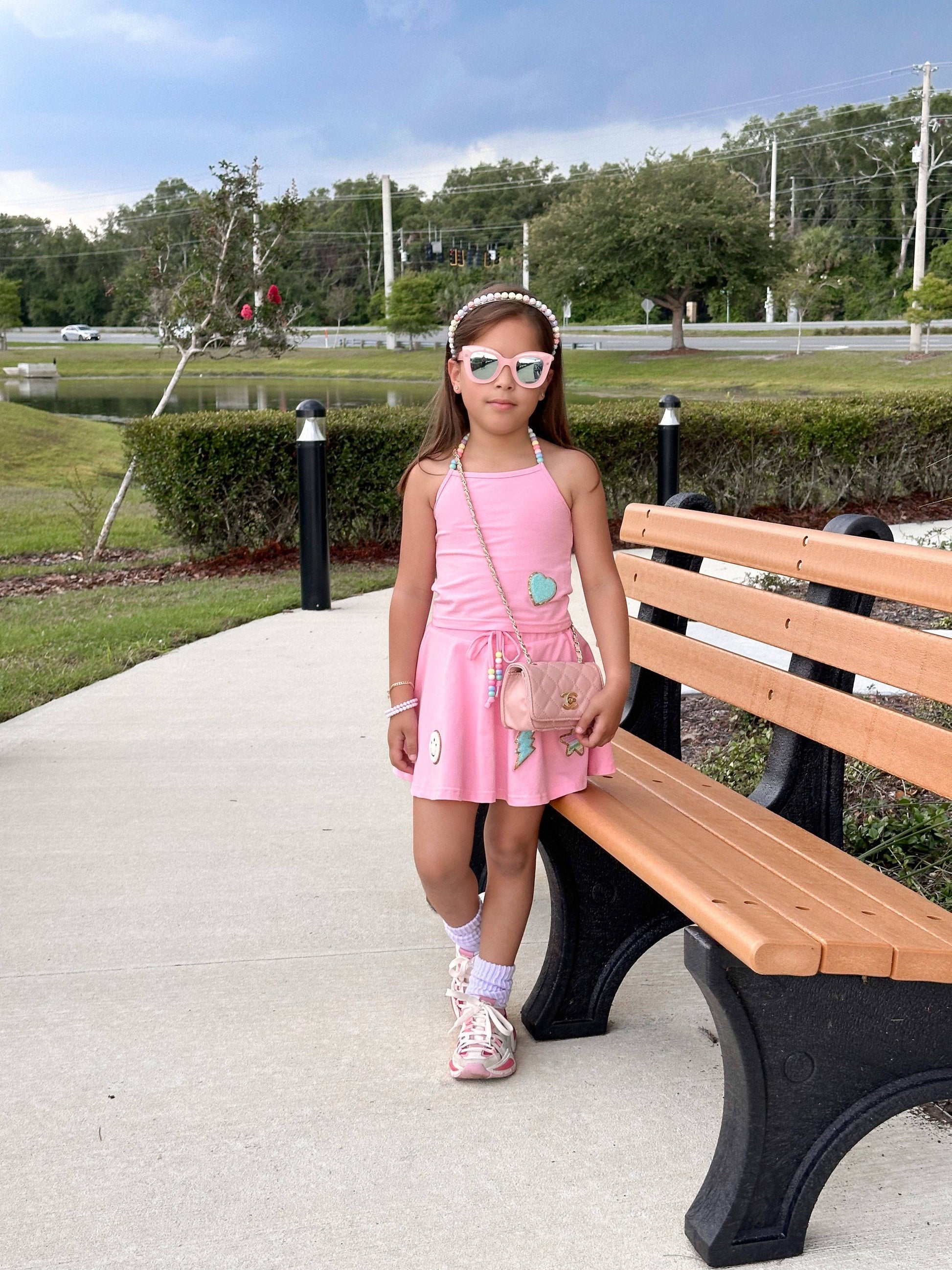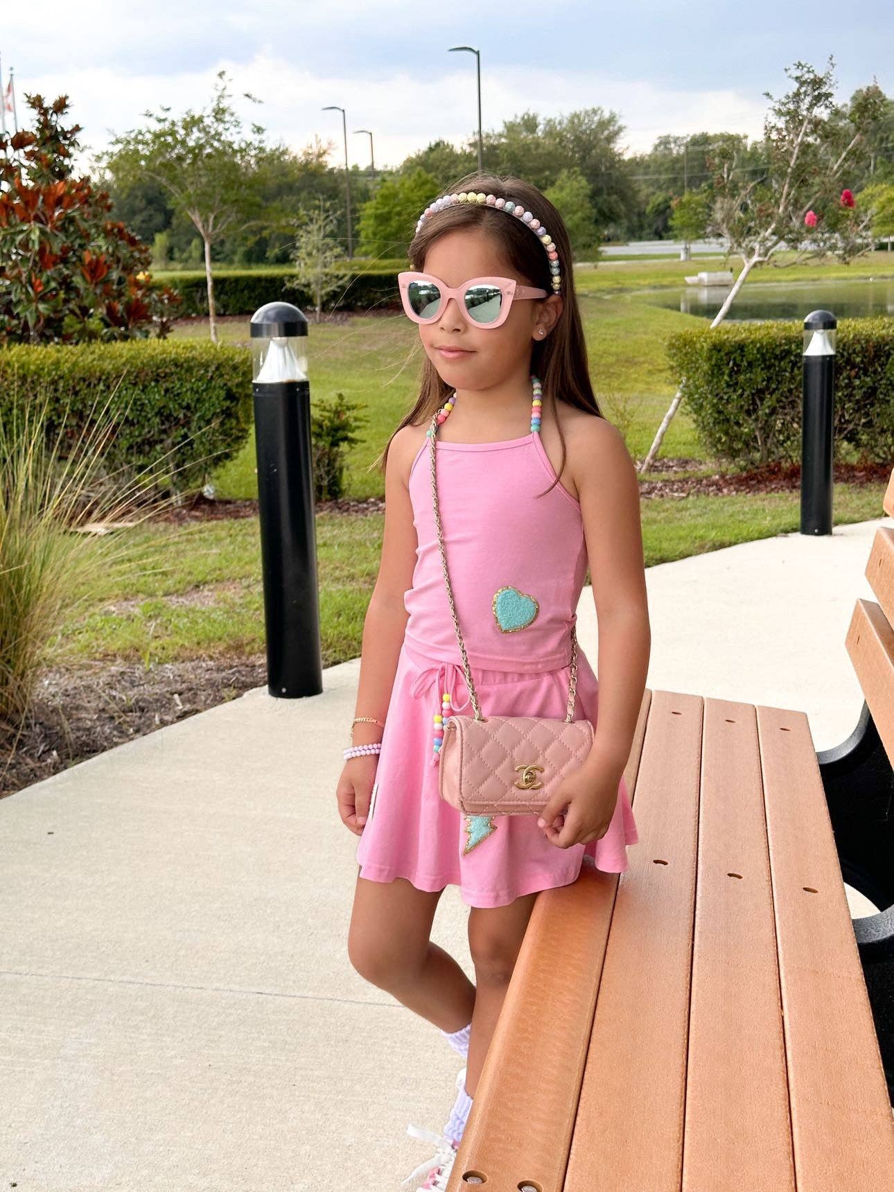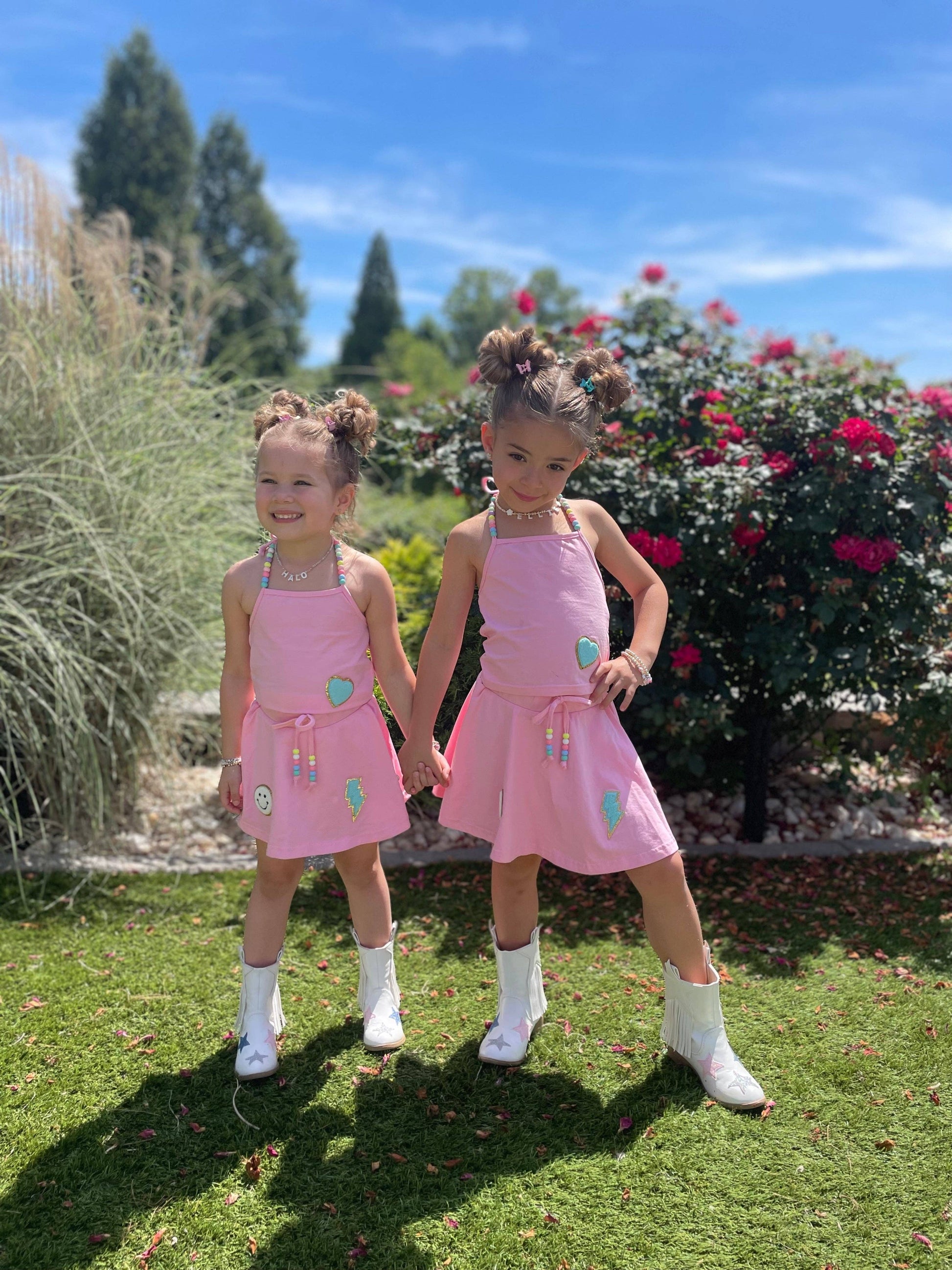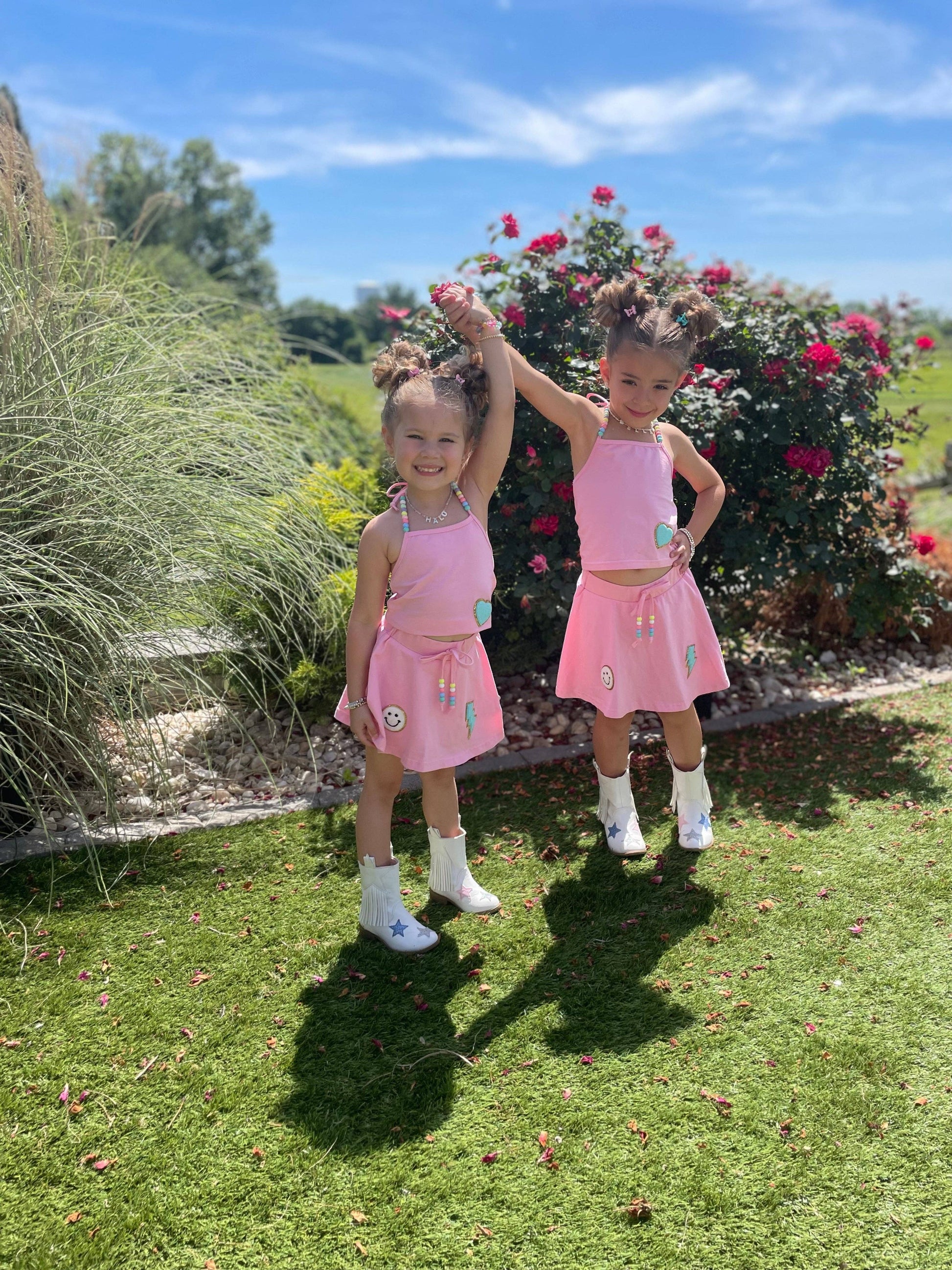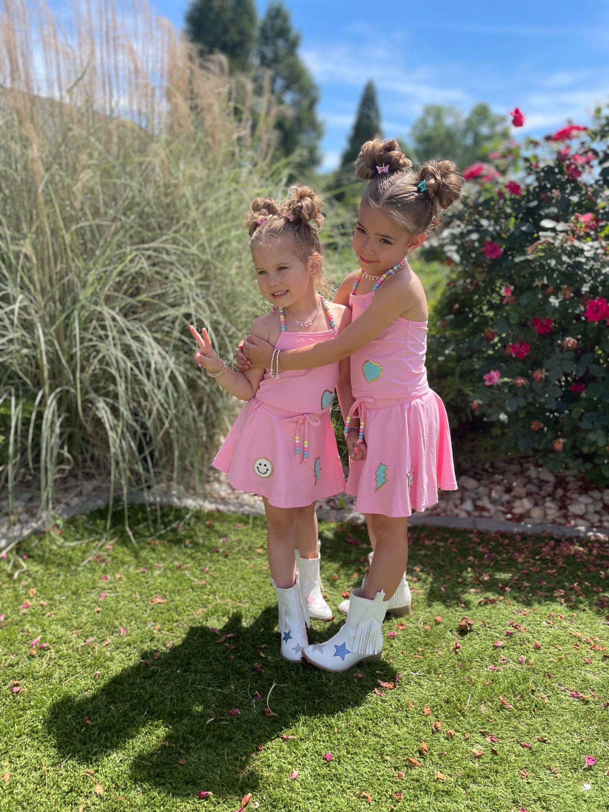 Check out our fun skort set! All patches are sewn on, and the pastel beads are the cutest addition! We've added shorts into the skirt for extra comfort. Soft and stretchy, this is the perfect set🩷 * 95% cotton, 5% polyester * Machine wash inside out on delicate/gentle cycle * Air dry