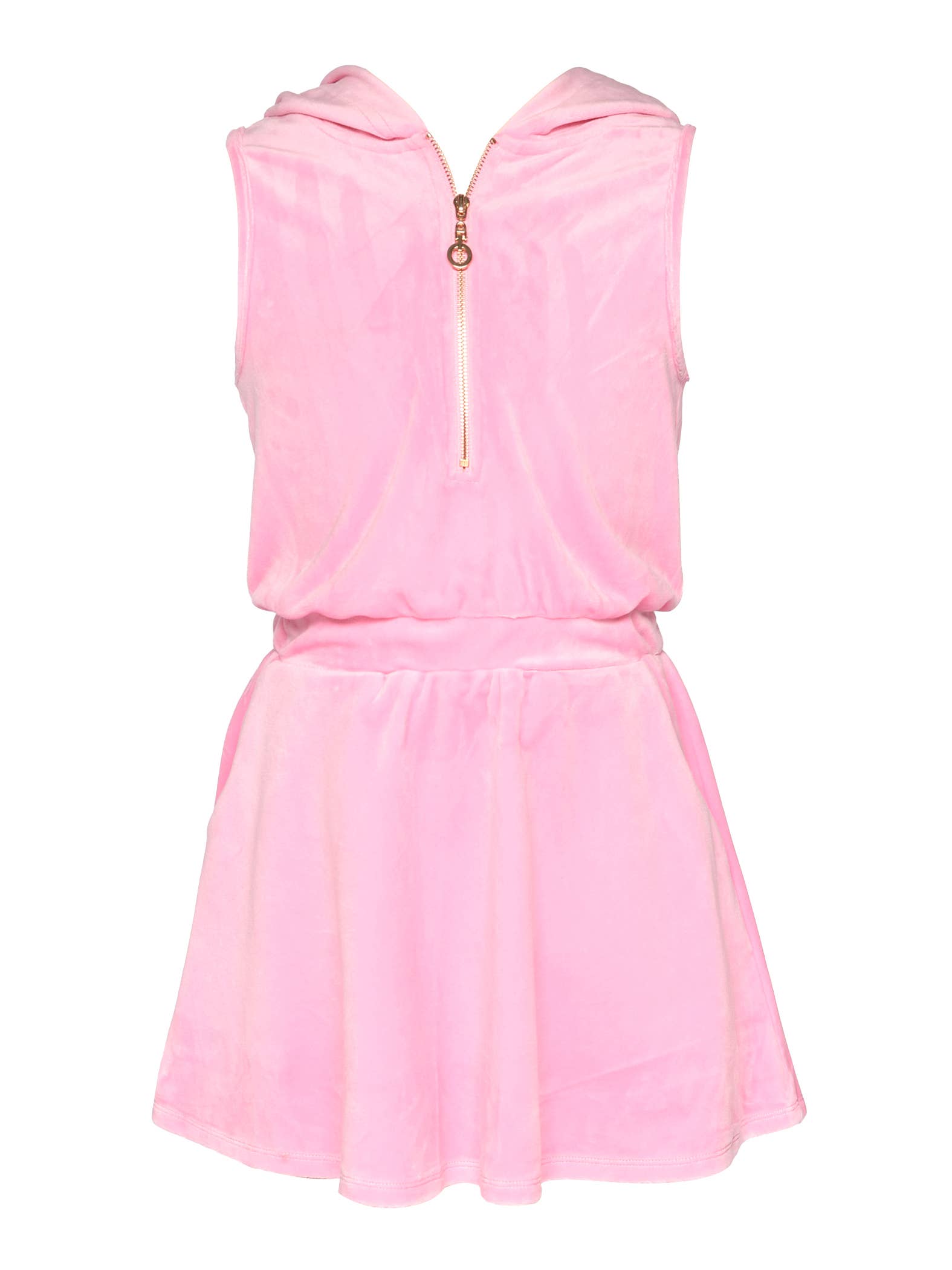 Chic meets cozy in this Sleeveless Velour Half Zip Dress, designed for little, big, and tween girls. Crafted in ultra-soft pale pink velour, this dress features a stylish V-neckline with a gold-tone half zip and a relaxed dropped waist. Complete with a hood for a sporty twist, it’s the perfect mix of comfort and cool—ideal for layering or wearing solo on warmer days. V-neckline with gold hardware half-zip detail Sleeveless design for easy layering Soft, plush velour fabric in pale pink Dropped waist for a relaxed, modern fit Attached hoodie for a sporty, casual vibe Perfect for everyday wear, lounging, or play