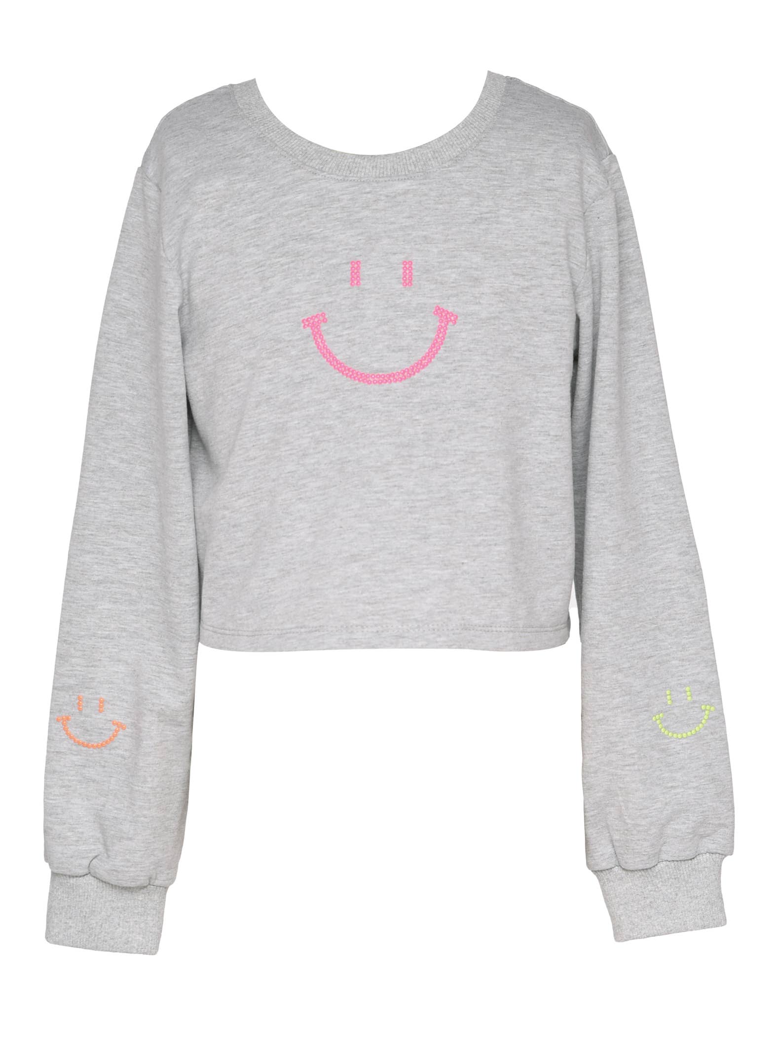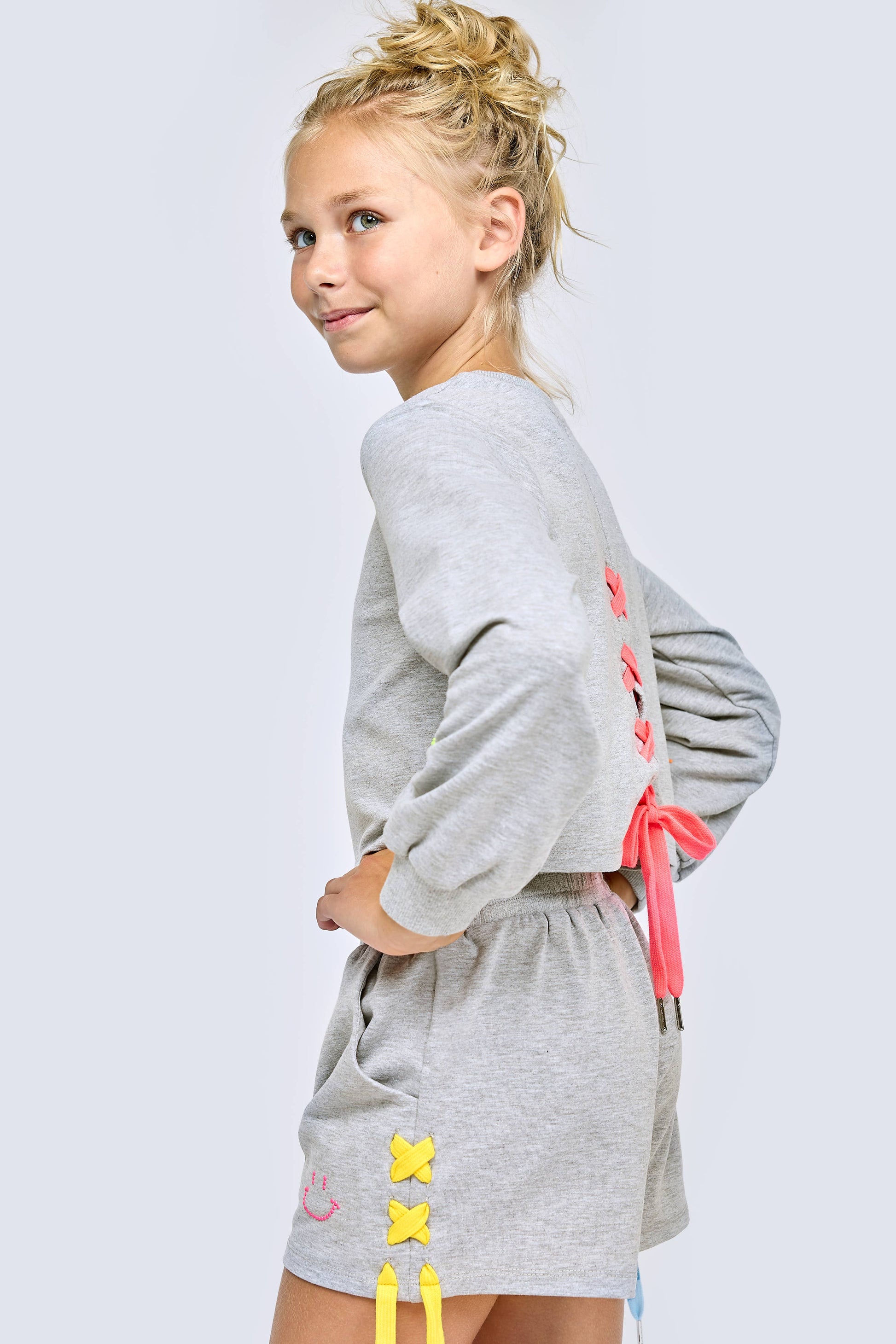 Add sparkle and smiles to her wardrobe with this playful Happy Emoji Rhinestone Lace-Up Top and shorts set! Featuring a comfy round neckline, trendy semi-cropped boxy fit, and long sleeves, this top stands out with a colorful rhinestone emoji graphic that radiates good vibes. The unique lace-up back tie detail adds a stylish twist, making it a fun choice for school days, hangouts, or weekend wear. Features: Round neckline Long sleeves for all-season wear Semi-cropped, boxy silhouette Colorful rhinestone happy emoji graphic Stylish lace-up back tie detail. Elastic waistband