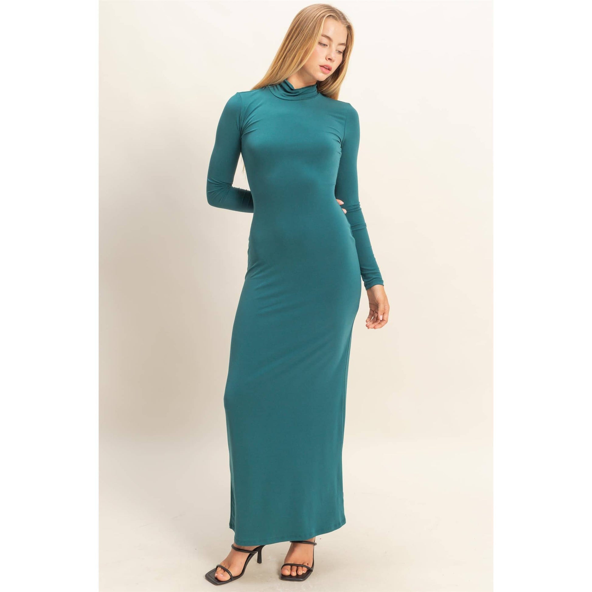 Turn heads in this form-fitting turtleneck maxi dress, designed with long sleeves and a subtly eased hem for comfortable movement. Chic and streamlined, it's perfect for date nights or daytime events. Pair with bold accessories or a tailored jacket for an effortlessly polished look.